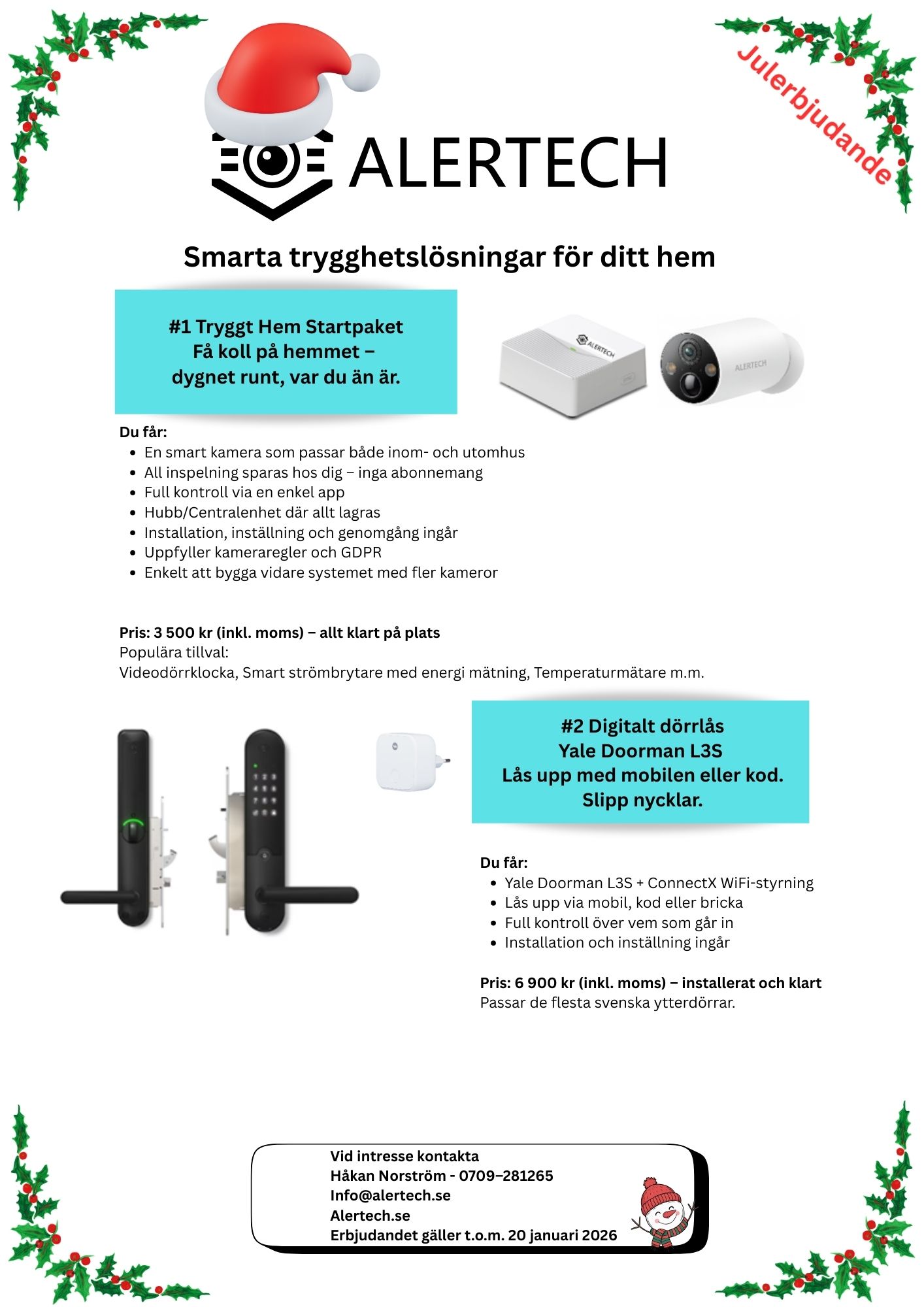 En stor efterfrågan är säkerhetslösningar utan månadsavgifter, framför allt med hemlarm som är en av våra specialiteter med kameraövervakning och inbrottslarm som kompletteras med smarta fastighetslösningar. Vanliga utökningar med stora säkerhetshöjande egenskaper är tex fukt/vattenlarm, brandvarning och temperaturlarm.